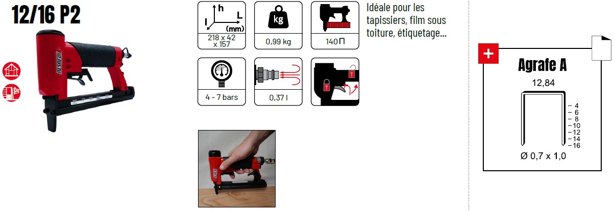 Avec l’agrafeuse pneumatique ALSAFIX 12/16 P2, vous bénéficiez d’un outil de qualité professionnelle pour obtenir des résultats durables et soignés dans tous vos travaux textiles et décoratifs.